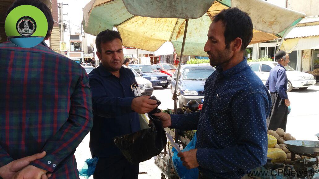 شایان ذکر است در این پایش به فروشندگان میوه و تره بار واقع در سه راهی خیابان همافران کیسه زباله داده شد.